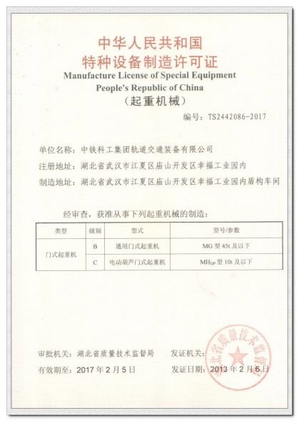 中华人民共和国特种设备制造许可证门式起重机C级