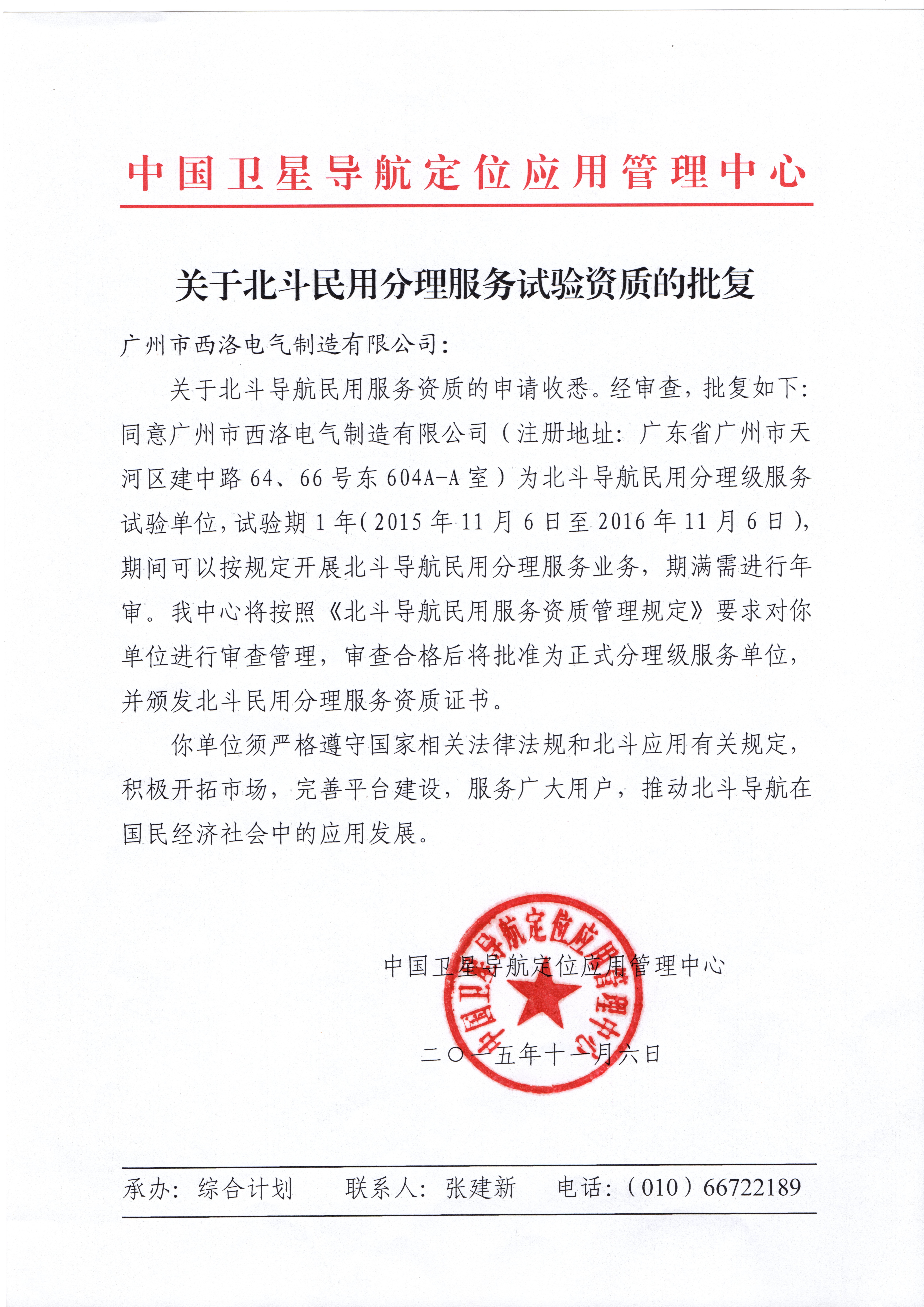 关于北斗民用分理服务试验资质的批复