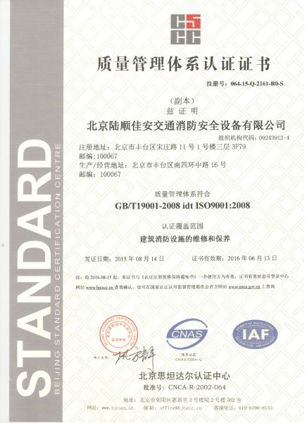 北京陆顺佳安交通消防安全设备有限公司是北京市公安消防局备案企业,中国消防协会会员单位,公司位于北京市丰台区南四环中路16号榴乡桥西南。 经营范围:交通消防器材、交通设施、消防工程、消防检测、灭火器年检、消防设施维修维护等。公司秉承“顾客至上,锐意进取”的经营理念,坚持“客户第一”的原则,为广大客户提供优质的服务!    主要经营内容:   1.专业批发销售各种灭火器及灭火器箱、消火栓箱及栓、枪扣、水带、自动喷淋系统、智能火灾报警及联动控制系统、防火枕、防火涂料、消防工具及灭火毯、消防服、消防应急灯、救生设备、标牌、路锥、太阳能回转灯、公路护栏、减速带、挡车柱、车位锁、大水马、施工牌、反光镜等。 2.专业维修检测灭火器及火灾探测器清洗。 3.公司拥有经验丰富的工程专业技术人员,拥有大...... [ 查看详情 ]