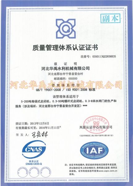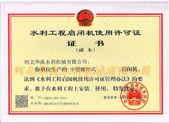 河北华禹水利机械有限公司是水利部定点生产启闭机、闸门的主要厂家,技术力量雄厚,设备完善先进。其产品封闭性强,质量可靠,深受广大用户的好评和信赖,其产品远销全国各地,为我国的水利事业做出了巨大的贡献。   我公司的主要产品有:螺杆启闭机从0.3吨到50吨,分单吊、双吊,共计20多种。有手动式、电动式、手电两用式、封闭式等多种型号。   闸门分铸铁和钢制两种。规格从0.2×0.2m到5×5m等多种规格。   卷扬式启闭机从5吨到达2×200吨等多种规格。   本公司为用户提供各种规格的橡胶止水带。   二○○二年度被中共河北省委、河北省人民政府评为“优秀私营企业”;被河北省工商行政管理局评为“省级重合同守信用企业”;二○○三年度我公司被授予“河北省科技企业”称号;被邢台市精神文明建设委员会评为“双文明单位”。二○...... [ 查看详情 ]